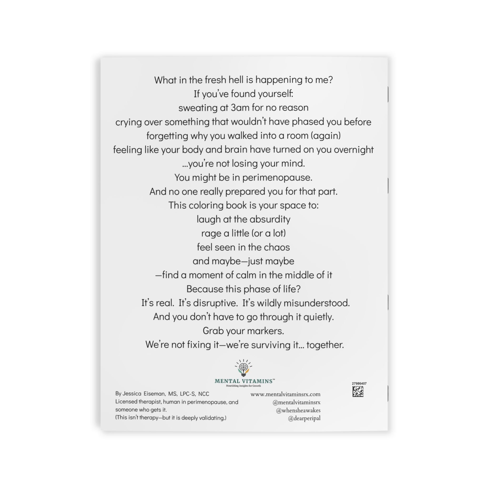 This perimenopause coloring book was created for women navigating the chaos of midlife shifts: the hot flashes, mood swings, brain fog, rage, tears, and everything in between.